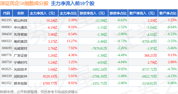 资金流向方面,深证民企50(970057)指数成份股当日主力资金净流出合计137.72亿元,游资资金净流入合计64.31亿元,散户资金净流入合计73.42亿元。成份股资金流向详情见下表: