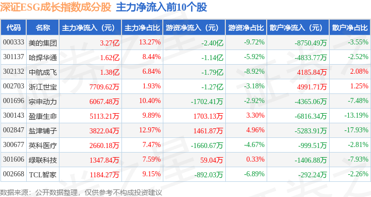 资金流向方面,深证ESG成长(970060)指数成份股当日主力资金净流出合计135.46亿元,游资资金净流入合计62.51亿元,散户资金净流入合计72.94亿元。成份股资金流向详情见下表: