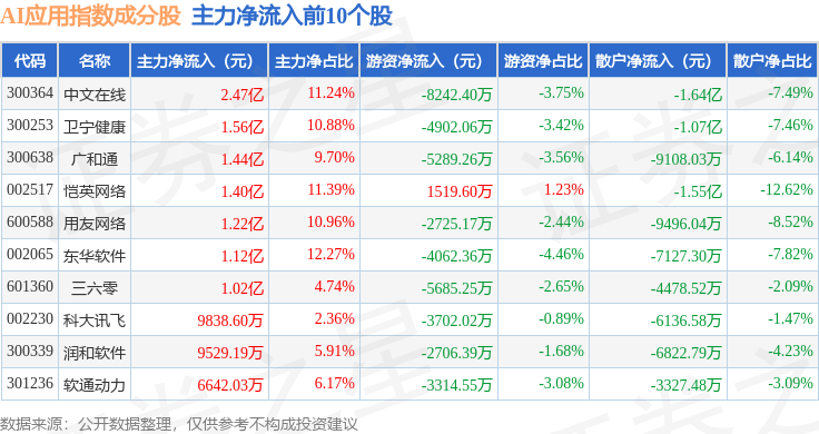 资金流向方面,AI应用(980112)指数成份股当日主力资金净流出合计3.55亿元,游资资金净流入合计1.03亿元,散户资金净流入合计2.52亿元。成份股资金流向详情见下表: