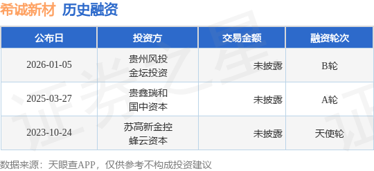 证券之星消息,根据天眼查APP于1月5日公布的信息整理,江苏希诚新材料科技有限公司B轮融资,融资额未披露,参与投资的机构包括贵州风投,金坛投资。