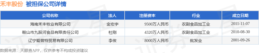 禾丰股份1月7日披露7笔对外担保,被担保公司4家。对外担保明细如下表: