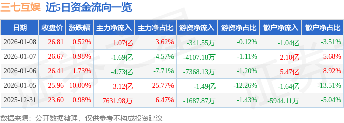 证券之星消息,截至2026年1月8日收盘,三七互娱(002555)报收于26.81元,上涨0.52%,换手率6.96%,成交量111.24万手,成交额29.62亿元。