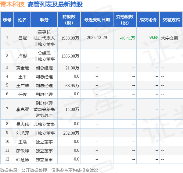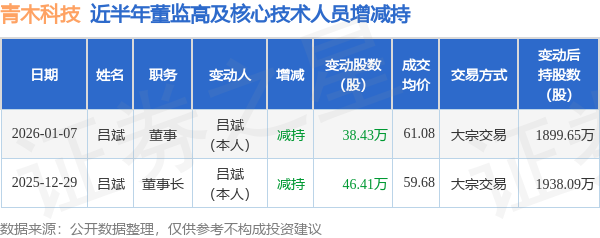 青木科技近半年内的董监高及核心技术人员增减持详情如下: