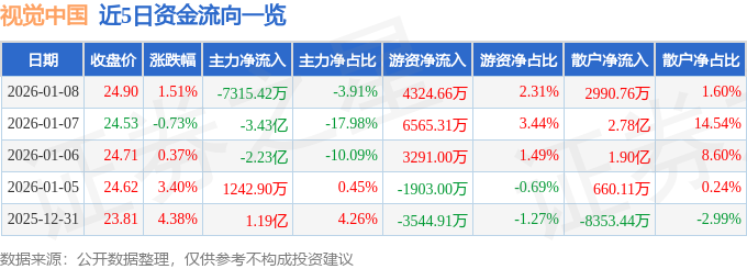 证券之星消息,截至2026年1月8日收盘,视觉中国(000681)报收于24.9元,上涨1.51%,换手率11.23%,成交量75.95万手,成交额18.73亿元。