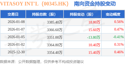 证券之星消息,1月8日南向资金增持18.8万股VITASOY INT'L(00345.HK)。近5个交易日中,获南向资金增持的有4天,累计净增持46.4万股。近20个交易日中,获南向资金增持的有11天,累计净增持82.0万股。截至目前,南向资金持有VITASOY INT'L(00345.HK)3385.4万股,占公司已发行普通股的3.23%。
