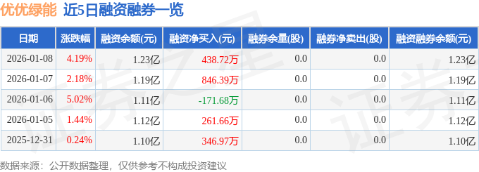优优绿能融资融券信息显示,融资方面,当日融资买入3951.71万元,融资偿还3513.0万元,融资净买入438.72万元。融券方面,融券卖出0.0股,融券偿还0.0股,融券余量0.0股,融券余额0.0万元。融资融券余额1.23亿元。