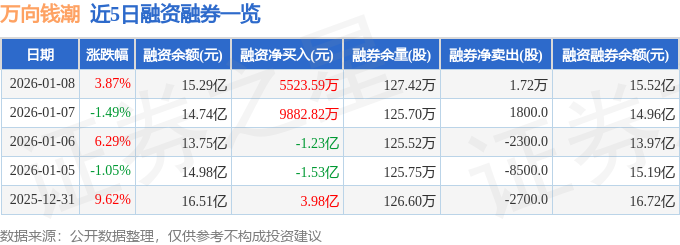 证券之星消息,截至2026年1月8日收盘,万向钱潮(000559)报收于18.51元,上涨3.87%,换手率10.12%,成交量335.47万手,成交额61.83亿元。