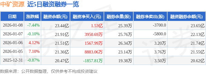 中矿资源融资融券信息显示,融资方面,当日融资买入5.21亿元,融资偿还3.68亿元,融资净买入1.53亿元,连续3日净买入累计2.08亿元。融券方面,融券卖出1.93万股,融券偿还2.3万股,融券余量25.39万股,融券余额2056.75万元。融资融券余额23.65亿元。