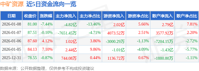 证券之星消息,截至2026年1月8日收盘,中矿资源(002738)报收于81.0元,下跌7.44%,换手率6.03%,成交量42.88万手,成交额35.79亿元。