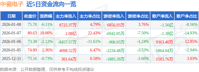 证券之星消息,截至2026年1月8日收盘,中瓷电子(003031)报收于75.7元,下跌6.11%,换手率6.95%,成交量23.63万手,成交额18.21亿元。
