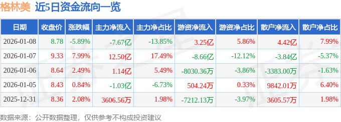 证券之星消息,截至2026年1月8日收盘,格林美(002340)报收于8.78元,下跌5.89%,换手率12.2%,成交量620.41万手,成交额55.36亿元。