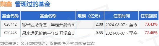 魏鑫先生:中国国籍,研究生、硕士。曾任海默科技股份有限公司研发中心工程师,东海证券股份有限公司TMT行业组长,海通证券股份有限公司计算机行业高级研究员,华泰资产管理有限公司高级投资经理,中国旅游产业基金管理有限公司投资部副总裁,现任易米基金管理有限公司多策略投资部副总经理、基金经理。2024年08月07日担任易米远见价值一年定期开放混合型证券投资基金基金经理。