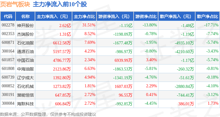 从资金流向上来看,当日页岩气板块主力资金净流出7373.73万元,游资资金净流入2.1亿元,散户资金净流出1.36亿元。页岩气板块个股资金流向见下表: