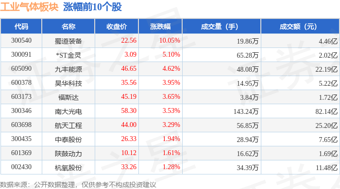 证券之星消息,1月9日工业气体板块较上一交易日上涨1.08%,蜀道装备领涨。当日上证指数报收于4120.43,上涨0.92%。深证成指报收于14120.15,上涨1.15%。工业气体板块个股涨跌见下表: