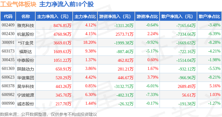 从资金流向上来看,当日工业气体板块主力资金净流出7.71亿元,游资资金净流入2.53亿元,散户资金净流入5.18亿元。工业气体板块个股资金流向见下表: