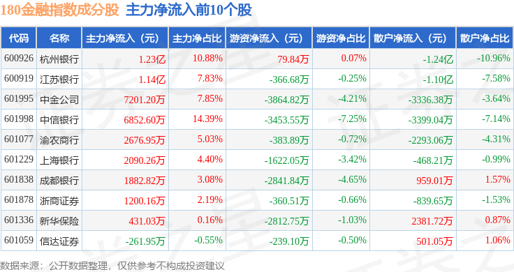资金流向方面,180金融(000018)指数成份股当日主力资金净流出合计58.49亿元,游资资金净流入合计30.49亿元,散户资金净流入合计27.99亿元。成份股资金流向详情见下表: