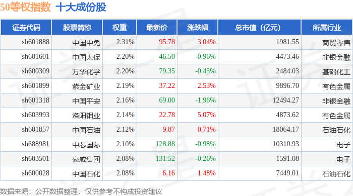 证券之星消息,1月9日,50等权(000050)指数报收于2501.86点,涨0.54%,成交1777.4亿元,换手率0.36%。当日该指数成份股中,上涨的有30家,洛阳钼业以5.07%的涨幅领涨,下跌的有19家,中微公司以2.66%的跌幅领跌。