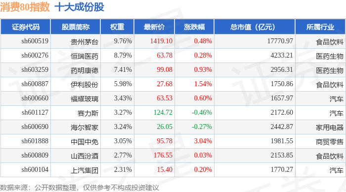 消费80(000069)指数十大成份股详情如下:
