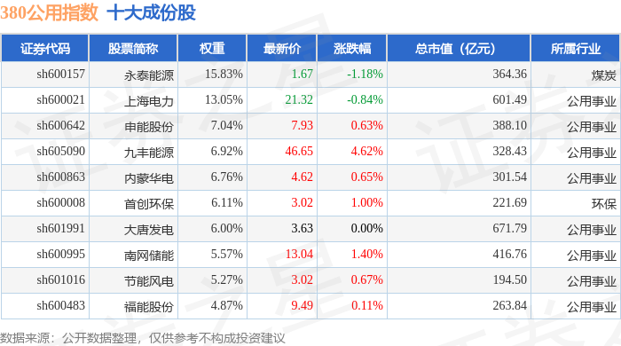 证券之星消息,1月9日,380公用(000113)指数报收于3094.6点,涨0.33%,成交80.43亿元,换手率1.62%。当日该指数成份股中,上涨的有14家,九丰能源以4.62%的涨幅领涨,下跌的有2家,永泰能源以1.18%的跌幅领跌。