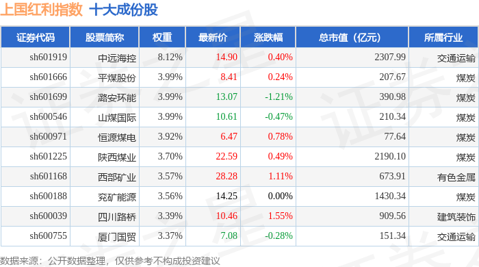证券之星消息,1月9日,上国红利(000151)指数报收于1561.13点,涨0.34%,成交225.45亿元,换手率0.39%。当日该指数成份股中,上涨的有16家,中国神华以2.41%的涨幅领涨,下跌的有11家,潞安环能以1.21%的跌幅领跌。