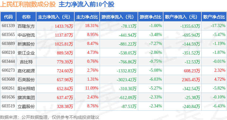 资金流向方面,上民红利(000153)指数成份股当日主力资金净流出合计1.38亿元,游资资金净流出合计4541.58万元,散户资金净流入合计1.84亿元。成份股资金流向详情见下表:
