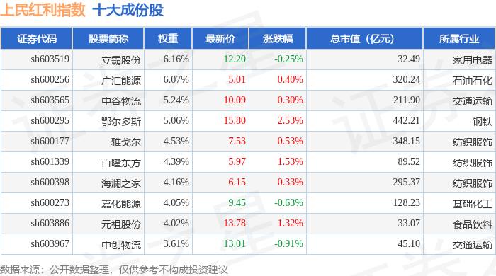 上民红利(000153)指数十大成份股详情如下: