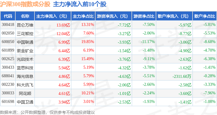 资金流向方面,沪深300(000300)指数成份股当日主力资金净流出合计93.86亿元,游资资金净流入合计20.86亿元,散户资金净流入合计73.0亿元。成份股资金流向详情见下表: