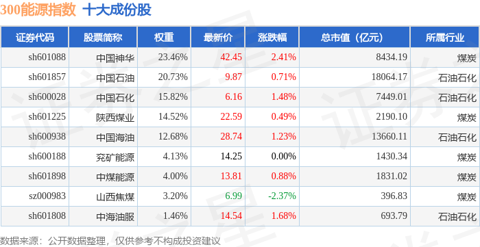 证券之星消息,1月9日,300能源(000908)指数报收于2396.66点,涨1.15%,成交118.93亿元,换手率0.39%。当日该指数成份股中,上涨的有7家,中国神华以2.41%的涨幅领涨,下跌的有1家,山西焦煤以2.37%的跌幅领跌。