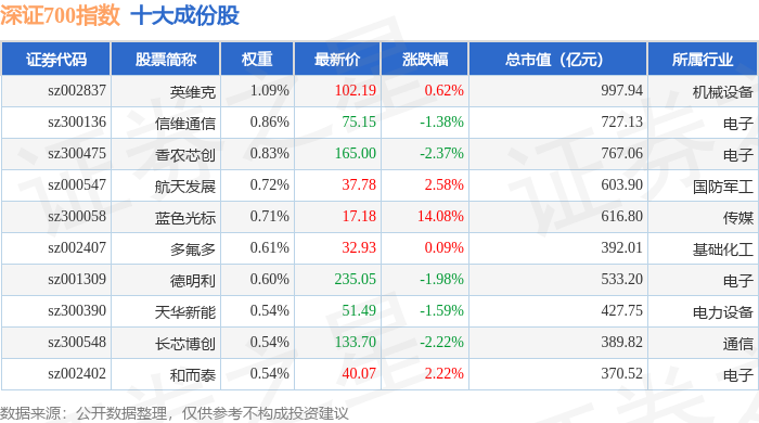 深证700(399010)指数十大成份股详情如下: