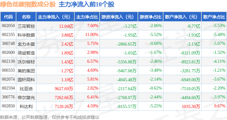 资金流向方面,绿色低碳(399258)指数成份股当日主力资金净流出合计2.04亿元,游资资金净流出合计12.63亿元,散户资金净流入合计14.67亿元。成份股资金流向详情见下表: