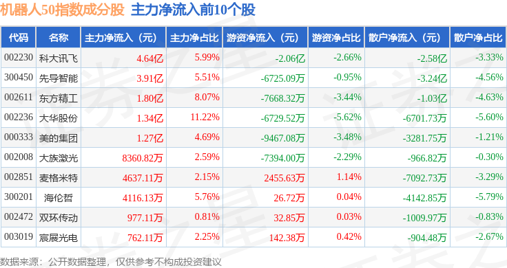 资金流向方面,机器人50(399283)指数成份股当日主力资金净流出合计3.65亿元,游资资金净流出合计5.0亿元,散户资金净流入合计8.65亿元。成份股资金流向详情见下表: