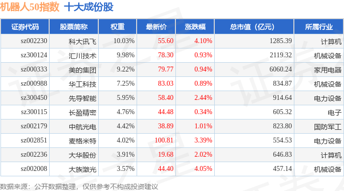 证券之星消息,1月9日,机器人50(399283)指数报收于4627.8点,涨1.63%,成交675.73亿元,换手率4.1%。当日该指数成份股中,上涨的有38家,海伦哲以9.54%的涨幅领涨,下跌的有12家,博杰股份以2.58%的跌幅领跌。