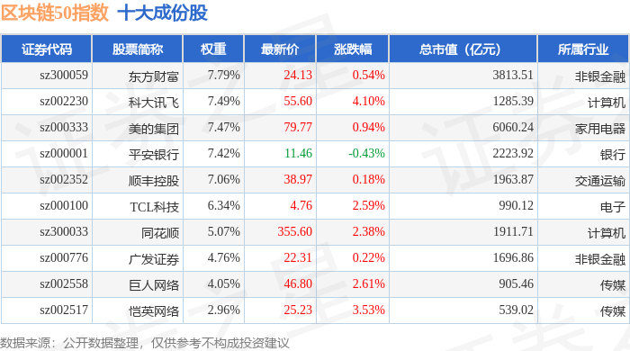 区块链50(399286)指数十大成份股详情如下: