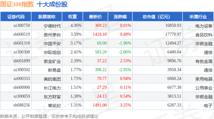 国证300(399312)指数十大成份股详情如下: