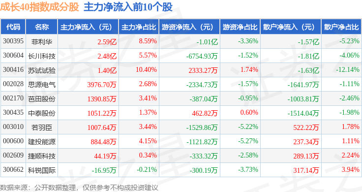 资金流向方面,成长40(399326)指数成份股当日主力资金净流出合计42.47亿元,游资资金净流入合计1.82亿元,散户资金净流入合计40.65亿元。成份股资金流向详情见下表: