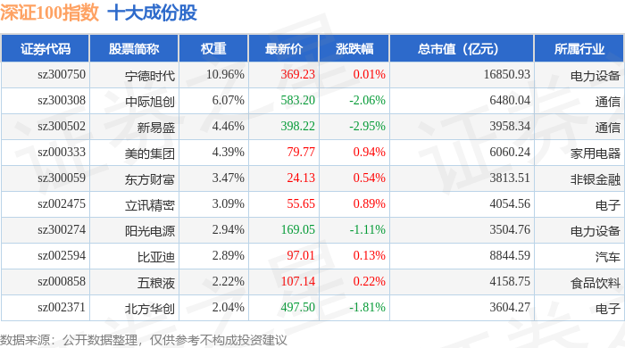 深证100(399330)指数十大成份股详情如下: