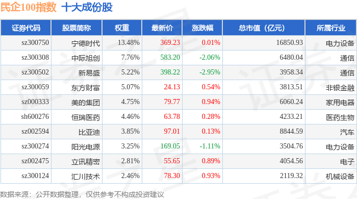 民企100(399362)指数十大成份股详情如下: