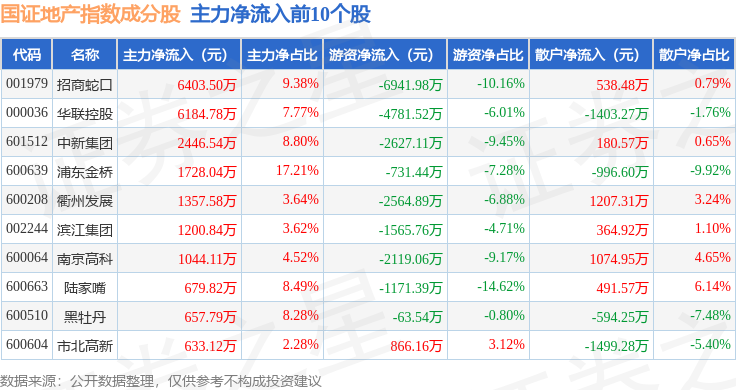 资金流向方面,国证地产(399393)指数成份股当日主力资金净流出合计8.52亿元,游资资金净流出合计8384.28万元,散户资金净流入合计9.36亿元。成份股资金流向详情见下表:
