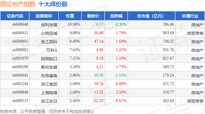 国证地产(399393)指数十大成份股详情如下: