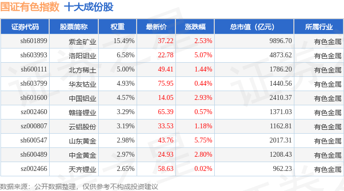 证券之星消息,1月9日,国证有色(399395)指数报收于10560.35点,涨3.08%,成交1143.55亿元,换手率2.93%。当日该指数成份股中,上涨的有49家,海亮股份以10.02%的涨幅领涨,下跌的有1家,中矿资源以0.86%的跌幅领跌。
