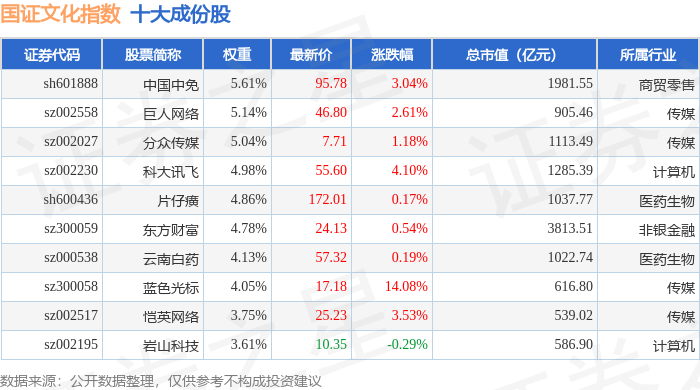 证券之星消息,1月9日,国证文化(399397)指数报收于2565.37点,涨3.88%,成交1162.67亿元,换手率6.51%。当日该指数成份股中,上涨的有46家,昆仑万维以19.99%的涨幅领涨,下跌的有3家,东阿阿胶以0.4%的跌幅领跌。