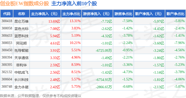 资金流向方面,创业板EW(399635)指数成份股当日主力资金净流出合计43.04亿元,游资资金净流入合计18.57亿元,散户资金净流入合计24.47亿元。成份股资金流向详情见下表:
