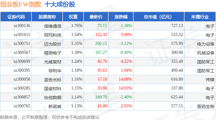 证券之星消息,1月9日,创业板EW(399635)指数报收于2366.4点,涨2.15%,成交3011.8亿元,换手率4.89%。当日该指数成份股中,上涨的有77家,昆仑万维以19.99%的涨幅领涨,下跌的有23家,常山药业以4.41%的跌幅领跌。