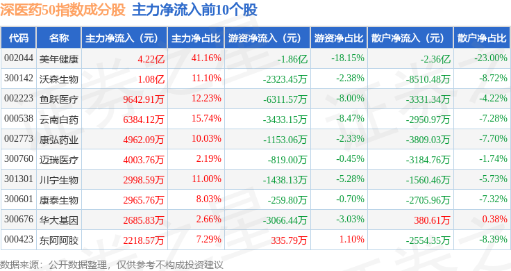 资金流向方面,深医药50(399647)指数成份股当日主力资金净流入合计6980.36万元,游资资金净流出合计2.61亿元,散户资金净流入合计1.92亿元。成份股资金流向详情见下表: