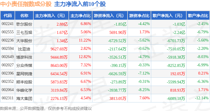 资金流向方面,中小责任(399651)指数成份股当日主力资金净流出合计1.19亿元,游资资金净流出合计5.71亿元,散户资金净流入合计6.9亿元。成份股资金流向详情见下表: