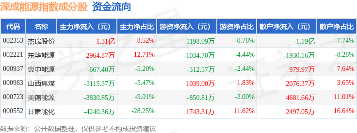 资金流向方面,深成能源(399680)指数成份股当日主力资金净流入合计4211.94万元,游资资金净流出合计613.85万元,散户资金净流出合计3598.09万元。成份股资金流向详情见下表:
