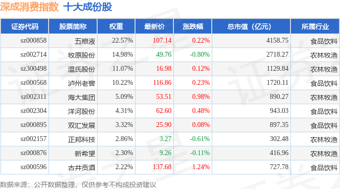证券之星消息,1月9日,深成消费(399684)指数报收于1810.95点,涨0.25%,成交118.7亿元,换手率1.06%。当日该指数成份股中,上涨的有23家,新诺威以2.93%的涨幅领涨,下跌的有4家,金禾实业以1.0%的跌幅领跌。