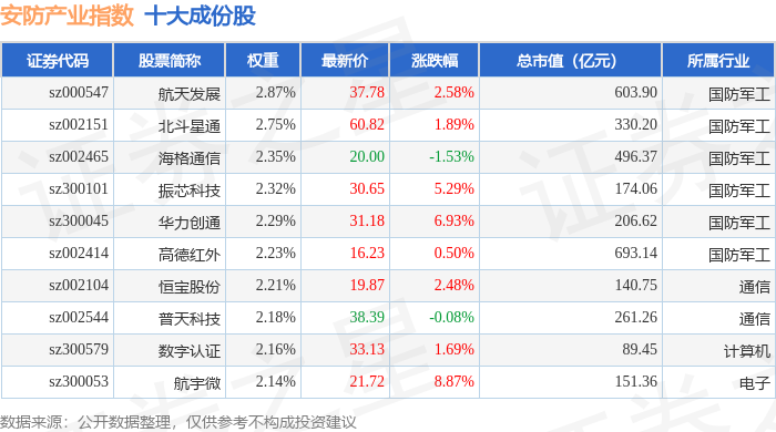 证券之星消息,1月9日,安防产业(399693)指数报收于5764.23点,涨2.25%,成交928.95亿元,换手率6.96%。当日该指数成份股中,上涨的有43家,东信和平以10.0%的涨幅领涨,下跌的有5家,海格通信以1.53%的跌幅领跌。