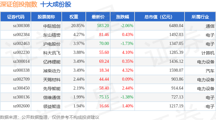 深证创投(399696)指数十大成份股详情如下: