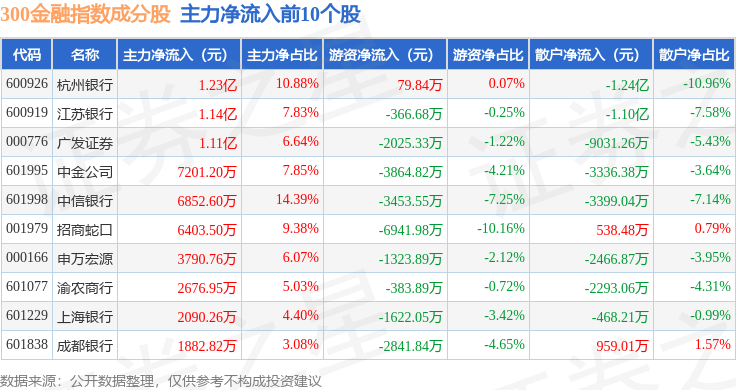 资金流向方面,300金融(399914)指数成份股当日主力资金净流出合计60.77亿元,游资资金净流入合计31.9亿元,散户资金净流入合计28.87亿元。成份股资金流向详情见下表: